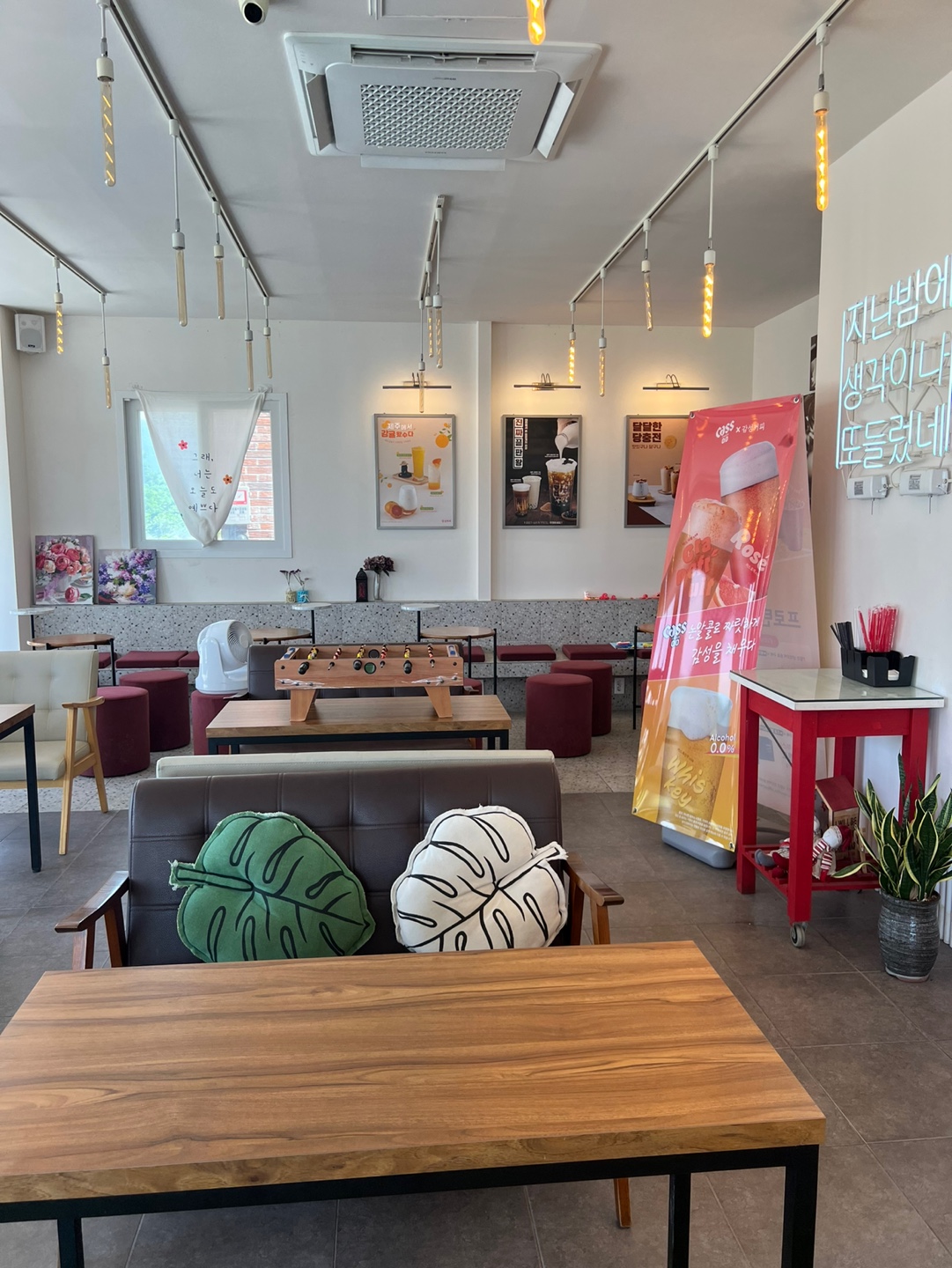 한쪽 벽면에는 “당신에게 좋은 건, 내겐 그냥 참을 수 없는 일” 네온 문구가 감성을 자극합니다.