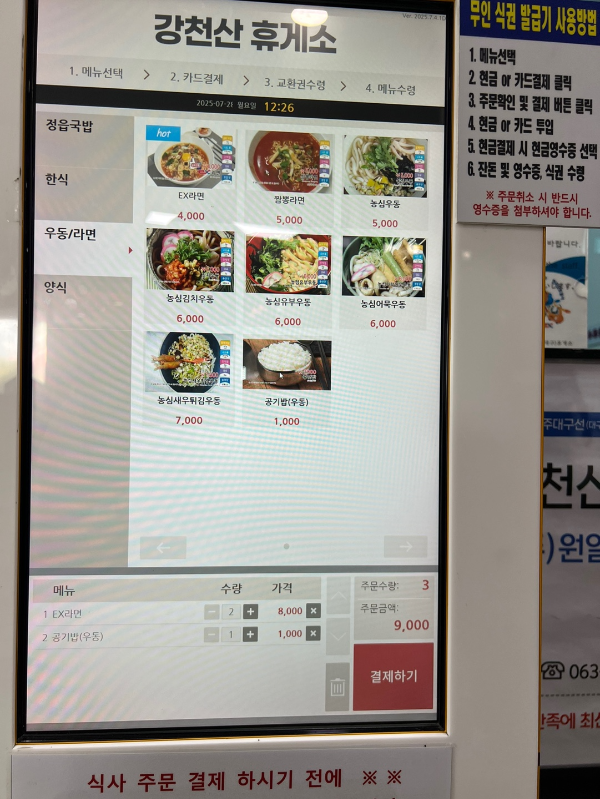 주문은 무인 키오스크에서 빠르게 해결할 수 있습니다. 다양한 메뉴 중 EX라면(4,000원)을 2개, 그리고 함께 곁들일 공기밥(1,000원)까지 선택했어요.