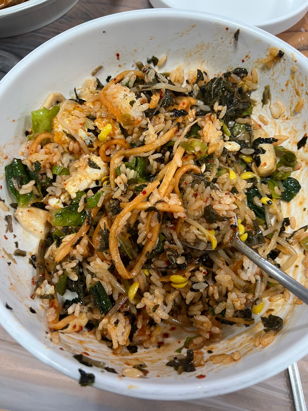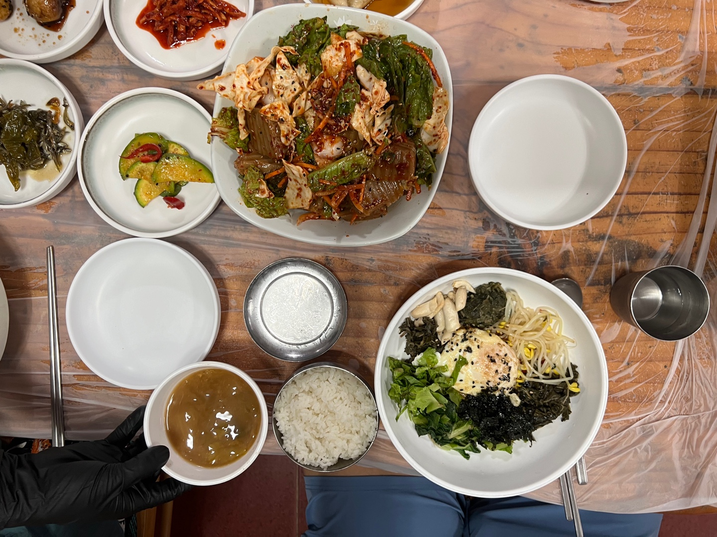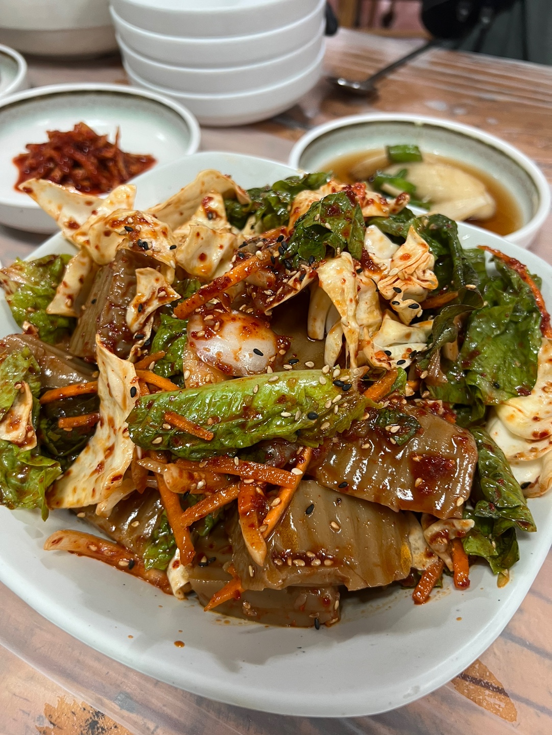 잠시 후 산채비빔밥과 도토리묵이 나왔습니다. 산채비빔밥은 나물과 고추장이 어우러진 푸짐한 비빔밥이었고, 도토리묵은 깔끔하게 썰려 나왔습니다. 첫 한입을 먹어보니 리뷰에서 언급된 대로 짠맛이 느껴졌습니다. 평소 음식을 싱겁게 먹는 편이라 짠맛이 더 강하게 느껴졌습니다. 도토리묵도 담백한 맛을 기대했으나, 입맛에 맞지 않았습니다.