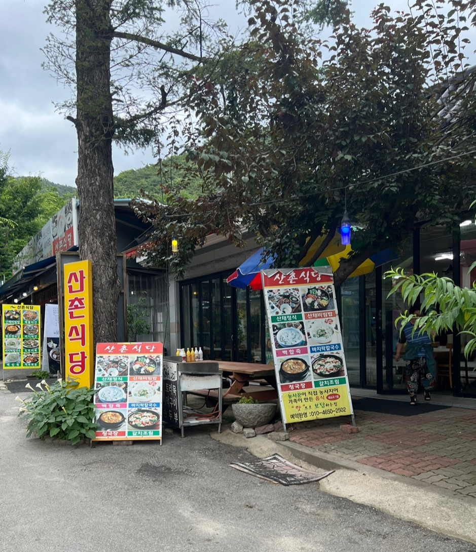 소박하지만 정겨운 느낌의 산촌식당 간판이 우리를 이끌었습니다. 내부는 많은 손님들로 북적였고, 이는 맛집일 가능성이 높다는 생각을 들게 했습니다. 주저하지 않고 산촌식당으로 들어갔습니다.