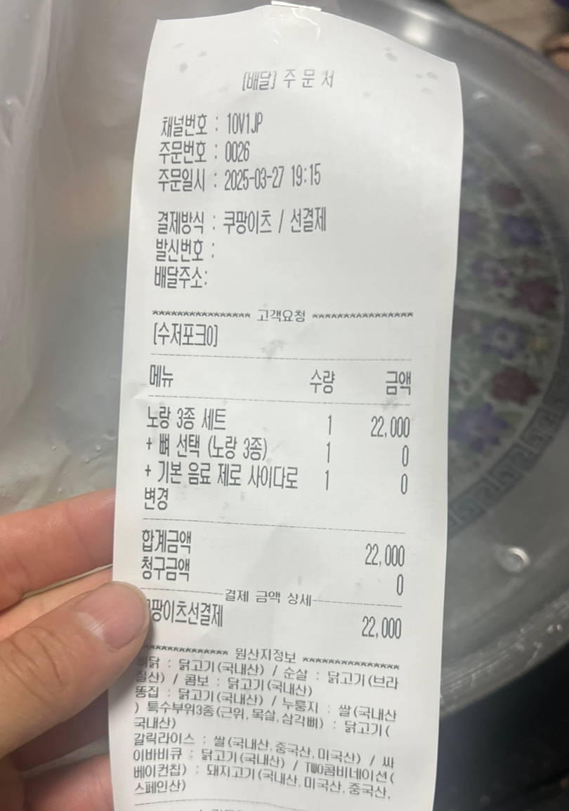 결국 고민 끝에 '노랑 3종 세트'를 뼈 있는 치킨으로 주문했답니다. 쿠팡이츠로 편하게 선결제했어요.