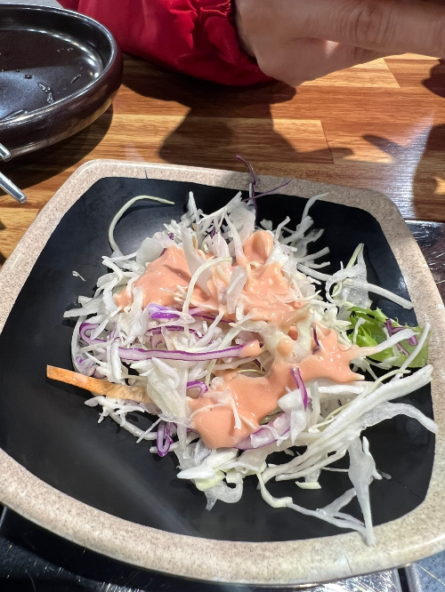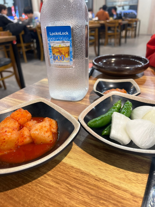 샐러드와 도토리묵, 깍두기, 고추 등이 준비되어 있어 해장국이 나오기 전까지 충분히 즐길 수 있었습니다. 배고픔을 달래기에 이보다 좋을 수 없었습니다.