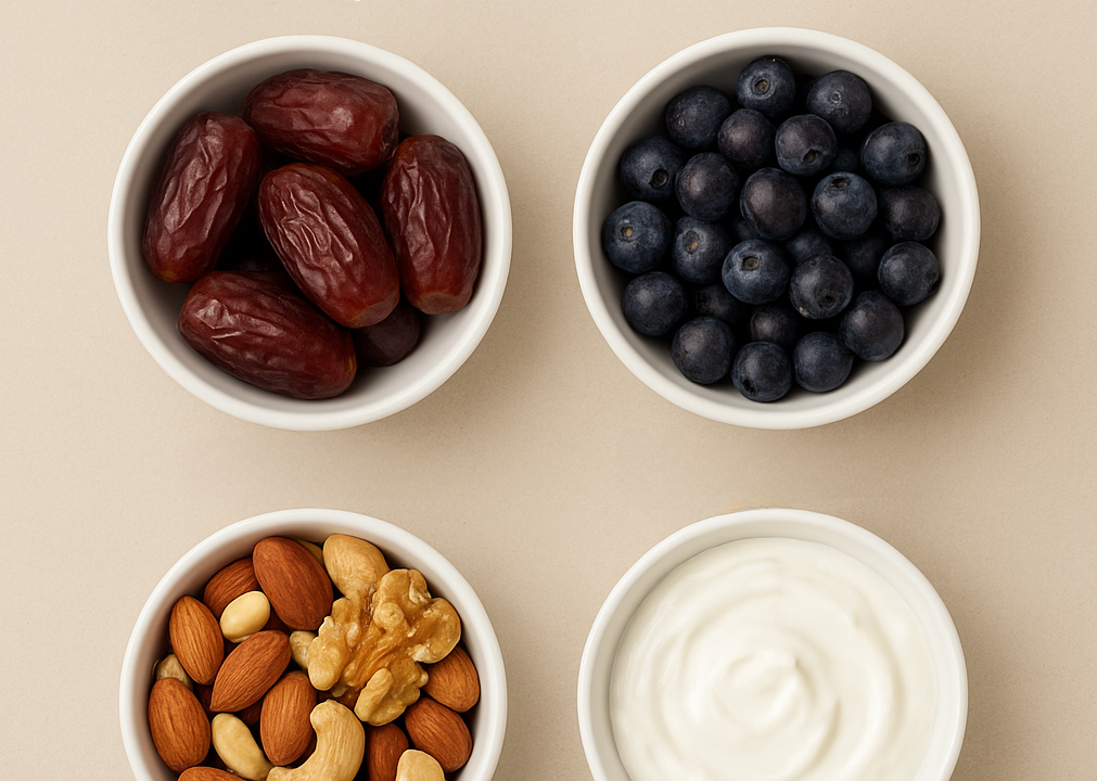 설탕을 넣지 않은 플레인 그릭요거트는 단백질이 풍부하면서도 속이 편안합니다. 과일, 대추야자, 견과류 등을 섞으면 맞춤형 건강 간식으로 변신! 기성품보다 직접 만든 수제 요거트를 추천드립니다.