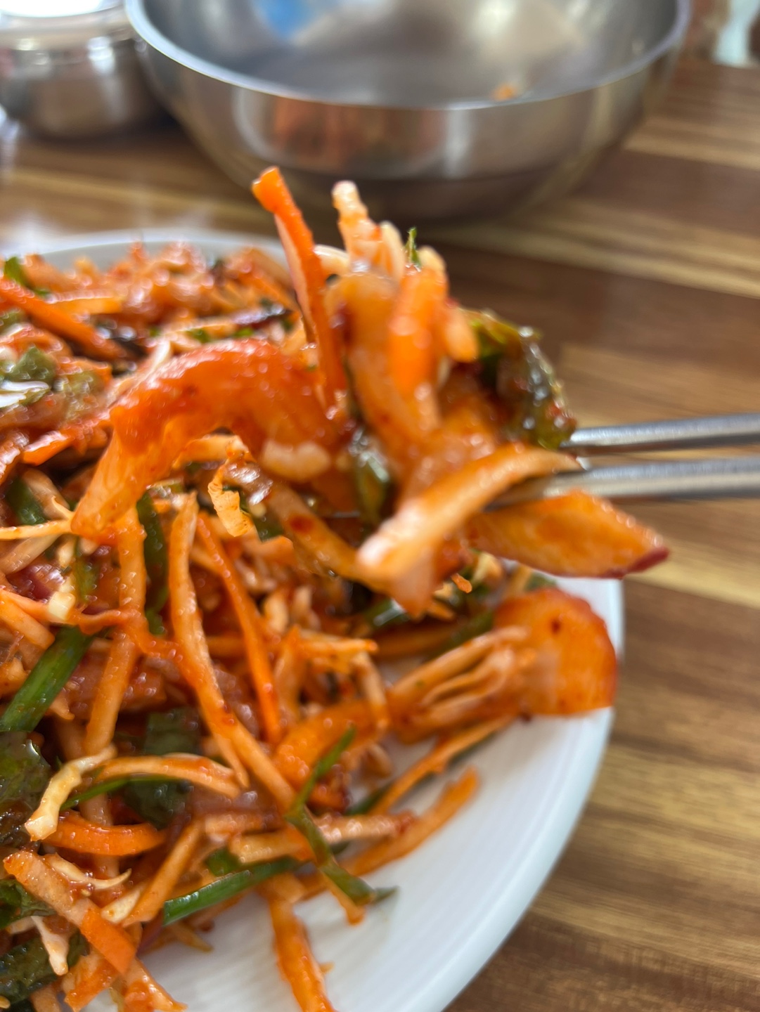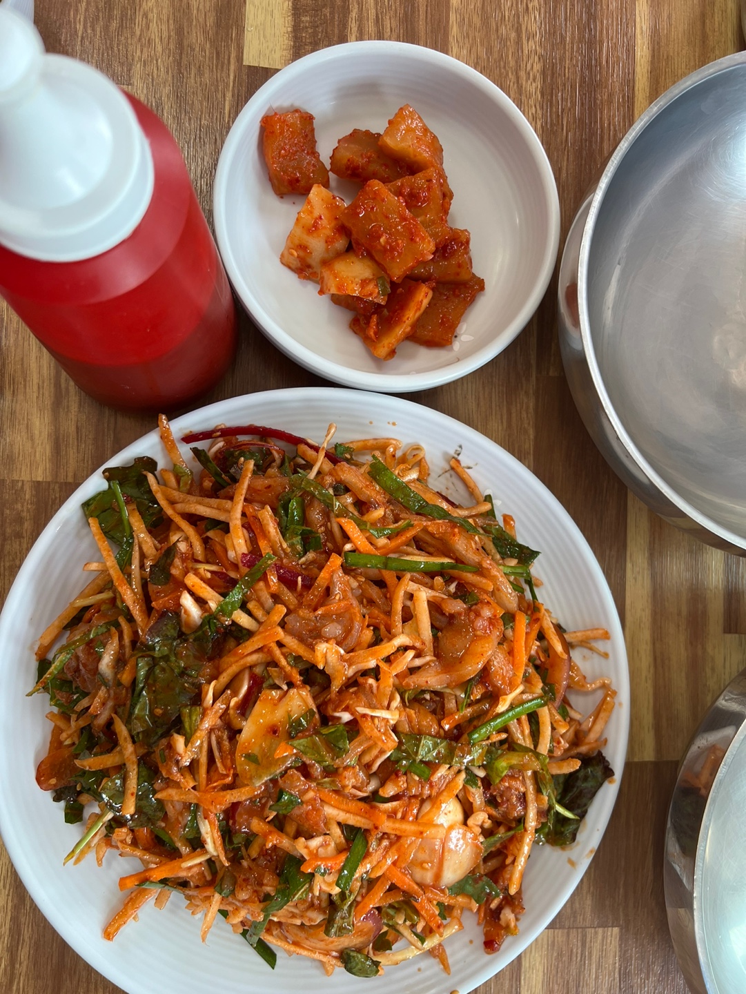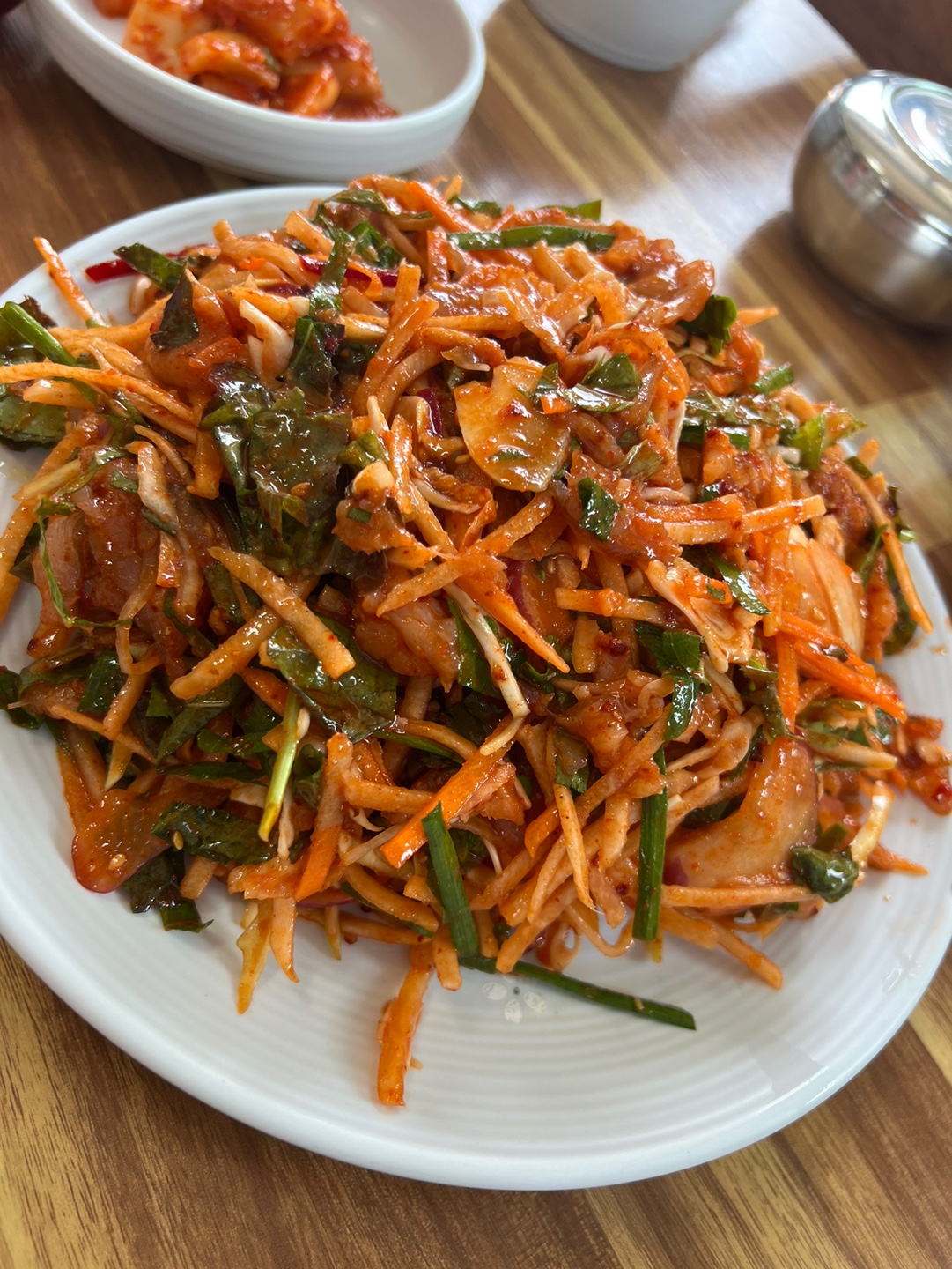 이번 식사 경험의 하이라이트는 단연코 미주구리회무침이었습니다. 신선한 생선회와 다채로운 채소들이 매콤한 양념에 버무려져 나오는 이 요리는 작은 김치 접시와 함께 제공되었습니다.
