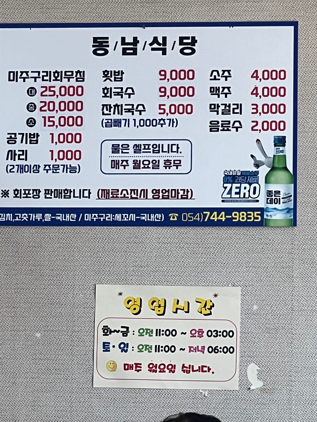 동남식당은 양남의 아름다운 해안가 근처에 위치해 있어 손님들에게 평온한 바다 풍경을 제공합니다. 식당의 외관은 소박하고 간단한 모습이지만, 내부에는 맛있는 요리들이 숨겨져 있습니다. 입구에는 영업 시간이 명확히 표시되어 있었는데, 화요일부터 금요일까지는 오전 11시부터 오후 3시까지, 토요일과 일요일에는 오전 11시부터 오후 6시까지 영업하며, 매주 월요일은 휴무입니다. 이러한 간단한 일정은 식당의 매력 중 하나로, 양보다 질을 중시하는 식당의 철학을 반영합니다.