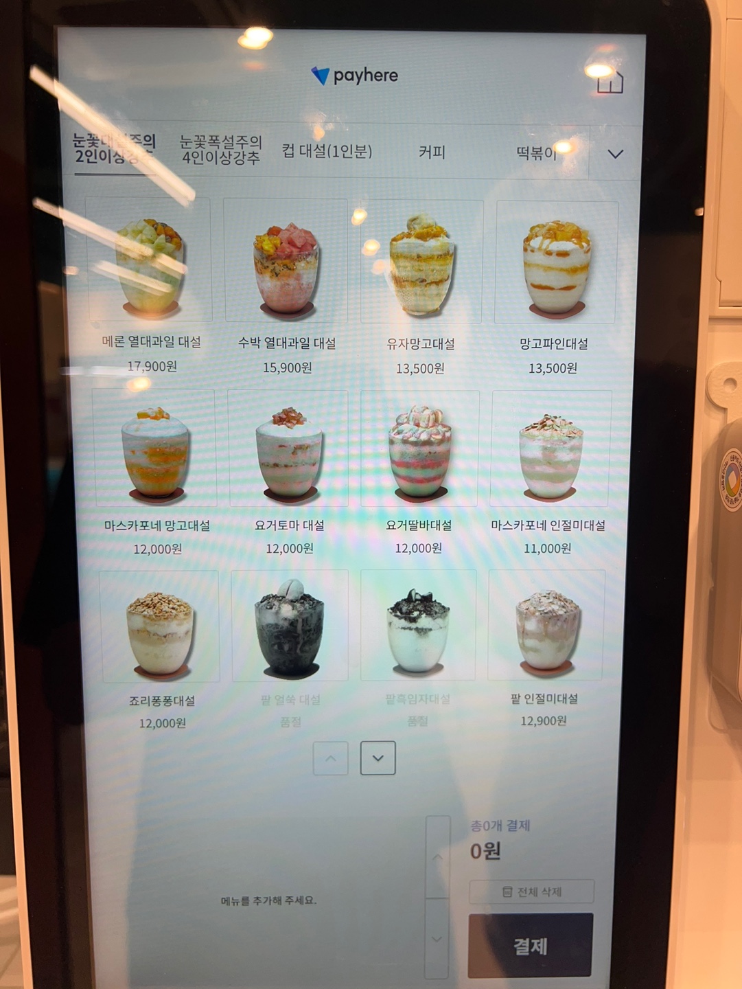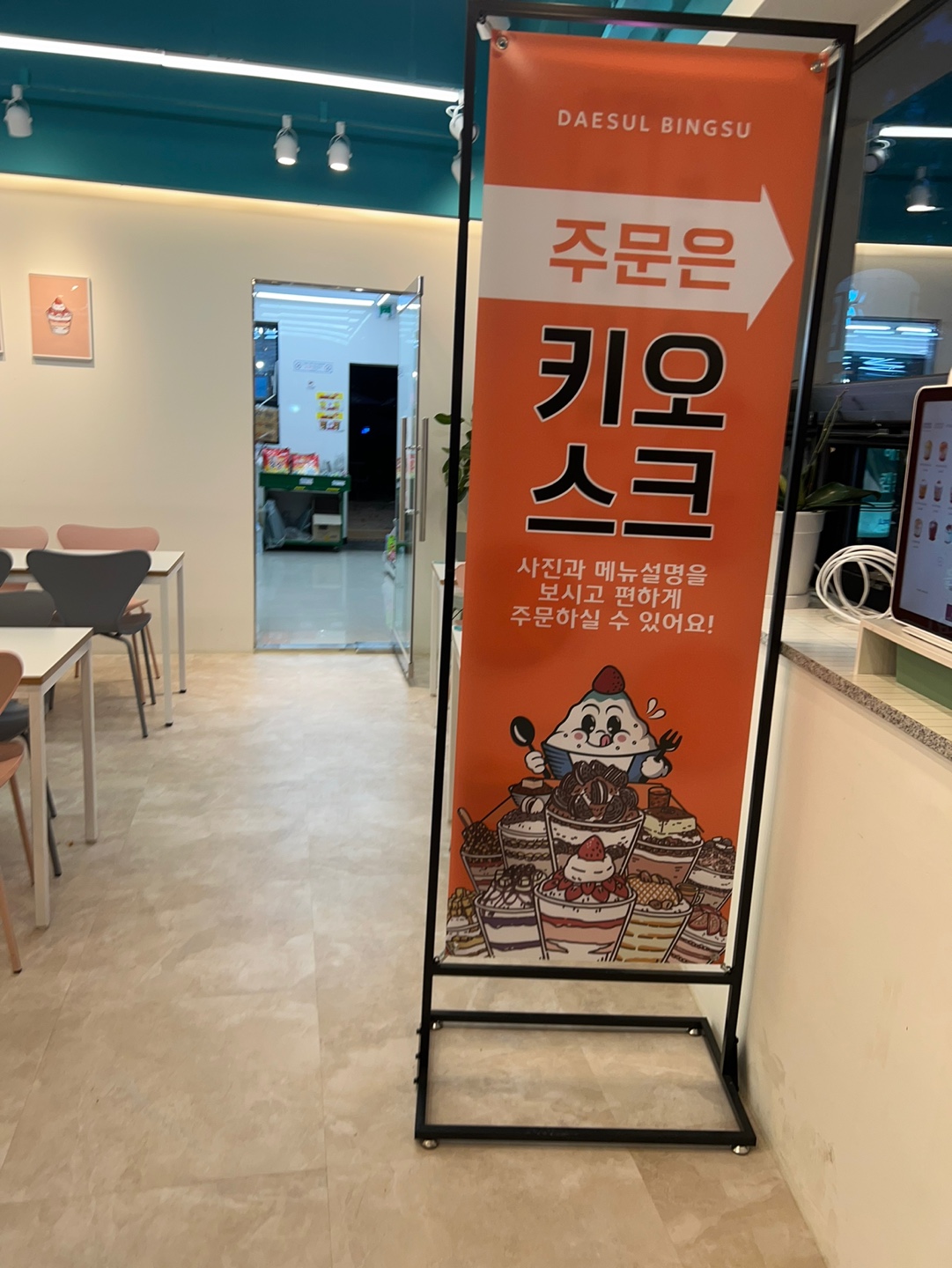 내부에 마련된 키오스크 주문 시스템은 사진과 함께 메뉴 설명이 자세히 적혀 있어 선택에 도움이 됩니다. 저는 "팥인절미대설"을 주문했는데, 다양한 재료들이 어우러진 팥빙수였습니다. 네이버 영수증 인증을 통해 무료로 제공받은 팝콘도 빙수와 함께 즐길 수 있어 색다른 재미를 더했습니다.
