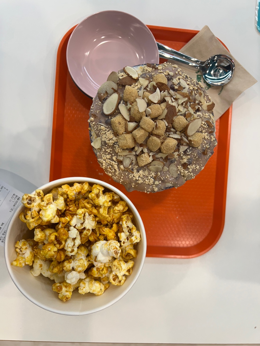 네이버 영수증 인증 이벤트를 통해 받은 팝콘은 바삭하고 달콤한 카라멜 맛이 인상적입니다. 빙수와 함께 먹으면 색다른 조합으로 즐길 수 있습니다.