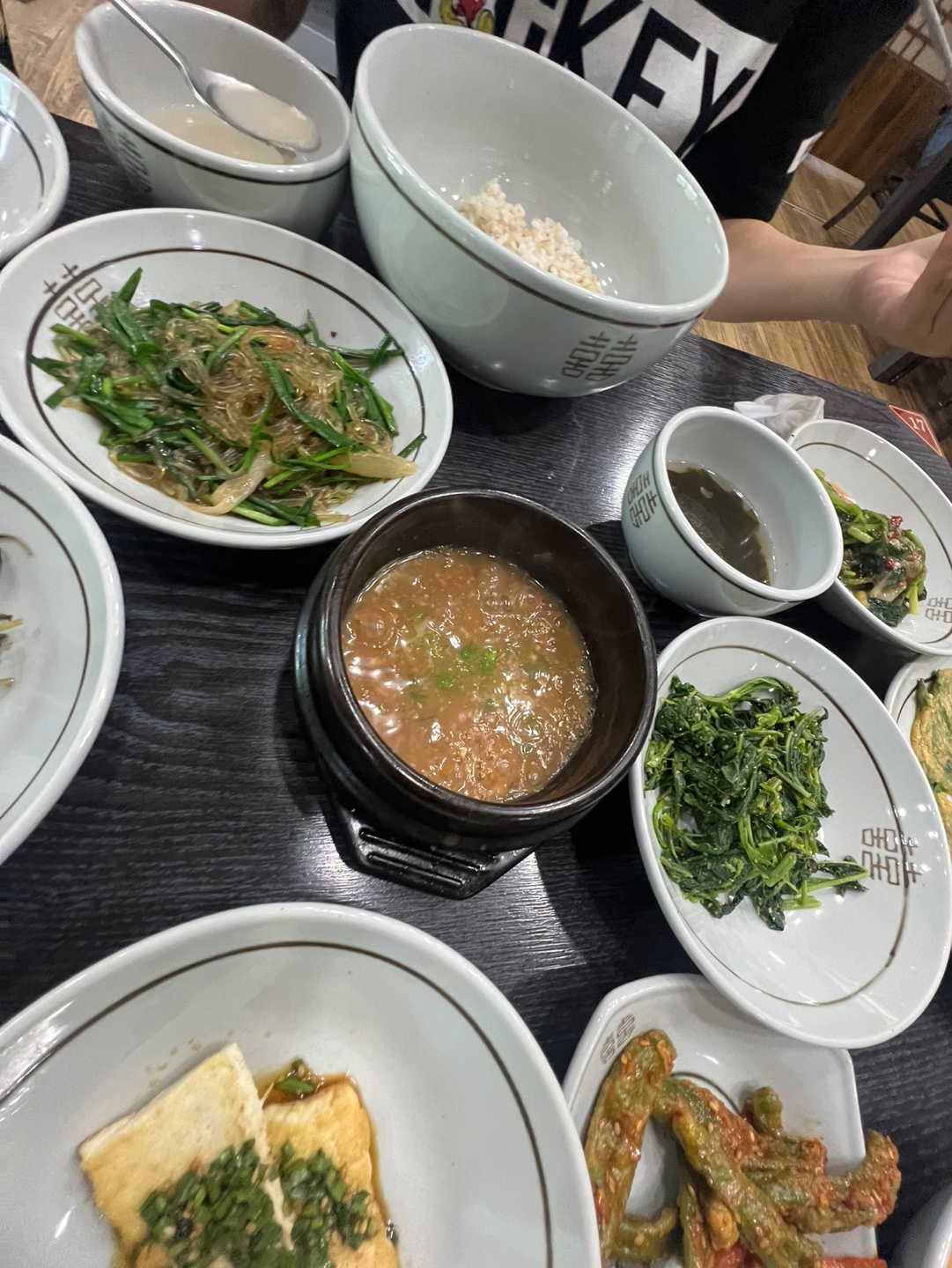 보리밥에 나물 반찬을 듬뿍 넣고 고추장과 참기름을 살짝 넣어 비비면 최고의 건강 비빔밥 완성! 콩나물무침, 나물, 무우채, 열무물김치, 오이소박이까지 다양한 재료가 어우러져 식감과 맛이 모두 살아있습니다. 된장찌개를 곁들이면 따로 반찬이 필요 없을 정도예요. 특히 보리밥은 퍼지지 않고 꼬들하게 잘 지어졌다는 점도 높이 평가하고 싶습니다.맛보기 돼지수육,부침개,생선조림,미역국,곰피무침,숭늉등..된장찌개