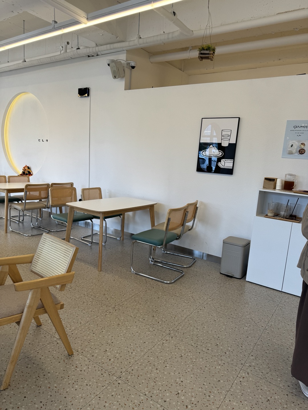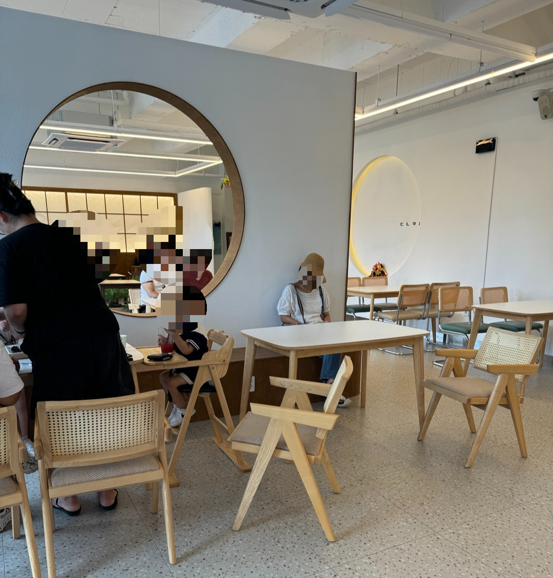 가게 안으로 들어가니 넓고 쾌적한 공간이 눈에 띄었습니다. 밝은 조명과 함께 따뜻한 나무 톤의 가구들이 어우러져 아늑한 분위기를 자아냈습니다. 특히 큰 원형 거울과 벽에 걸린 간단한 예술 작품들이 인상적이었습니다. 좌석 배치는 여유로워서 친구들과의 대화나 혼자만의 시간을 즐기기에 좋았습니다.