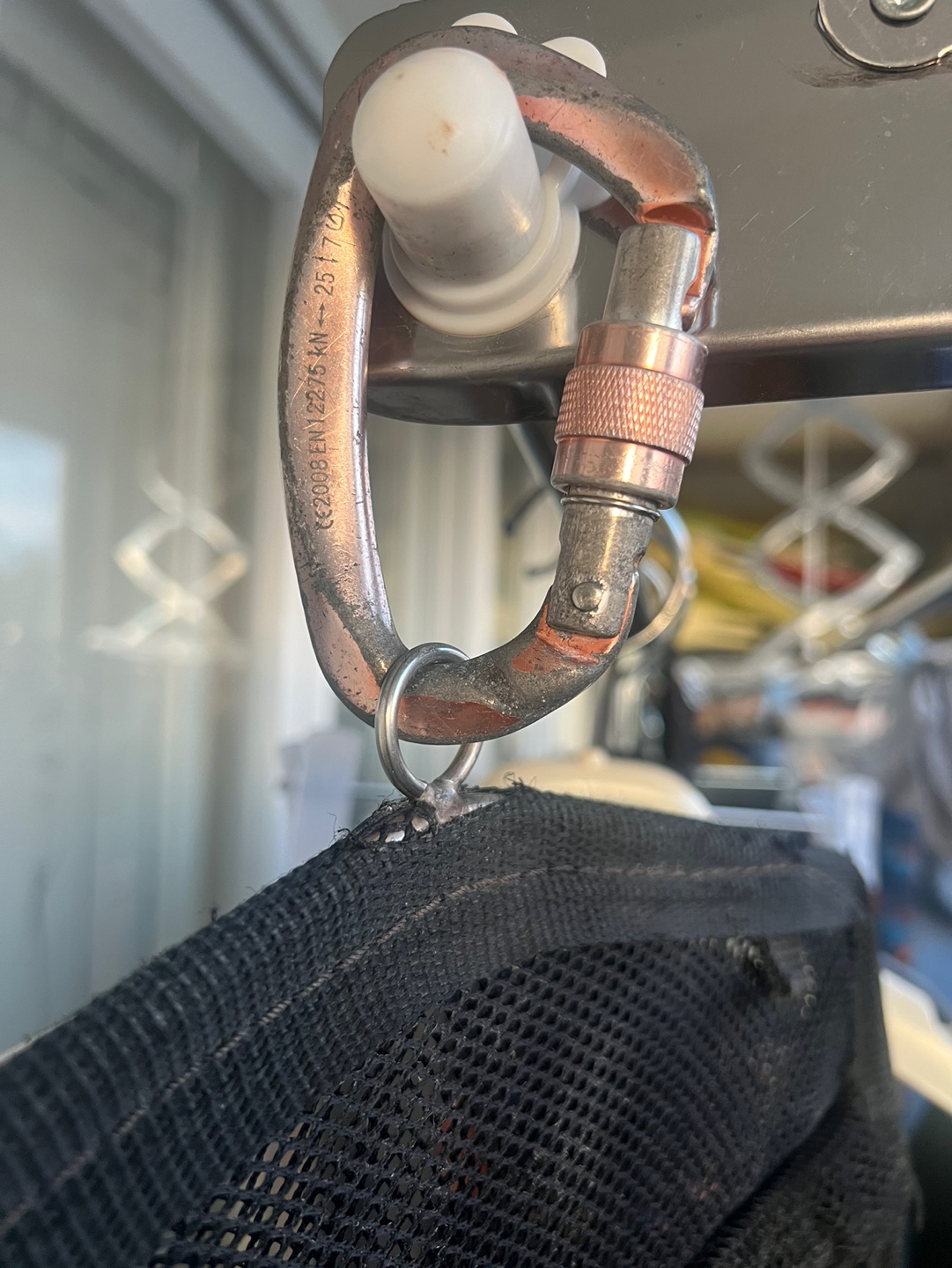 캐러비너는 D링과 조과망을 연결하는 데 사용되며, 크기와 내구성이 매우 중요합니다. 손에 잘 잡히는 크기의 제품을 선택하면 조작이 용이하며, 알루미늄 제품은 부식 방지 처리가 잘 된 고품질 제품을 추천합니다. 부식으로 인해 볼트가 풀리지 않는 상황을 방지하려면 가격이 다소 높더라도 신뢰할 수 있는 제품을 구매하세요.