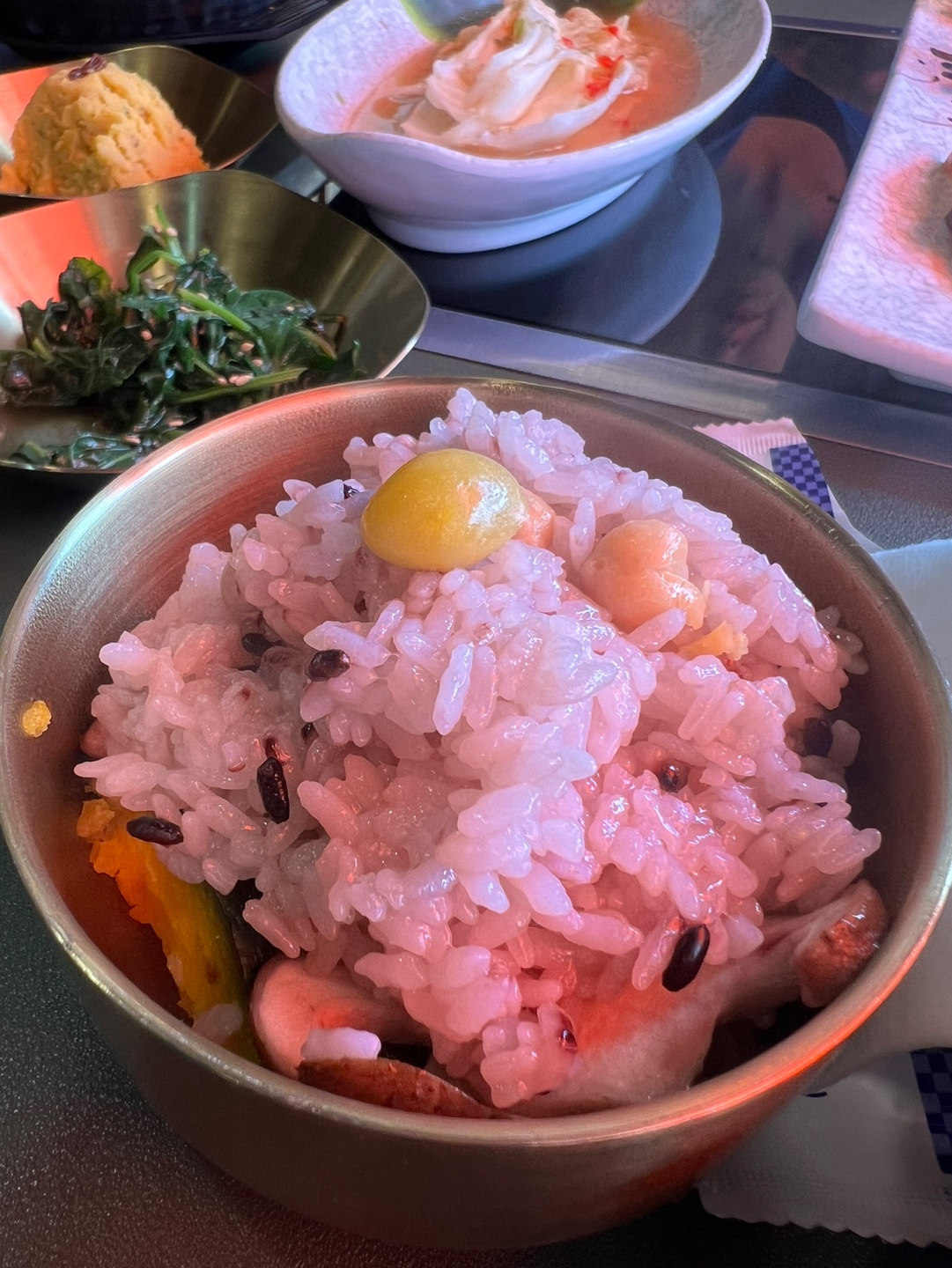 - 구성: 가마솥 영양밥, 돼지불고기, 된장찌개, 쌈채소, 야채 샐러드, 잡채, 새우장, 단호박 감자 샐러드, 메밀 전병, 계절반찬 등