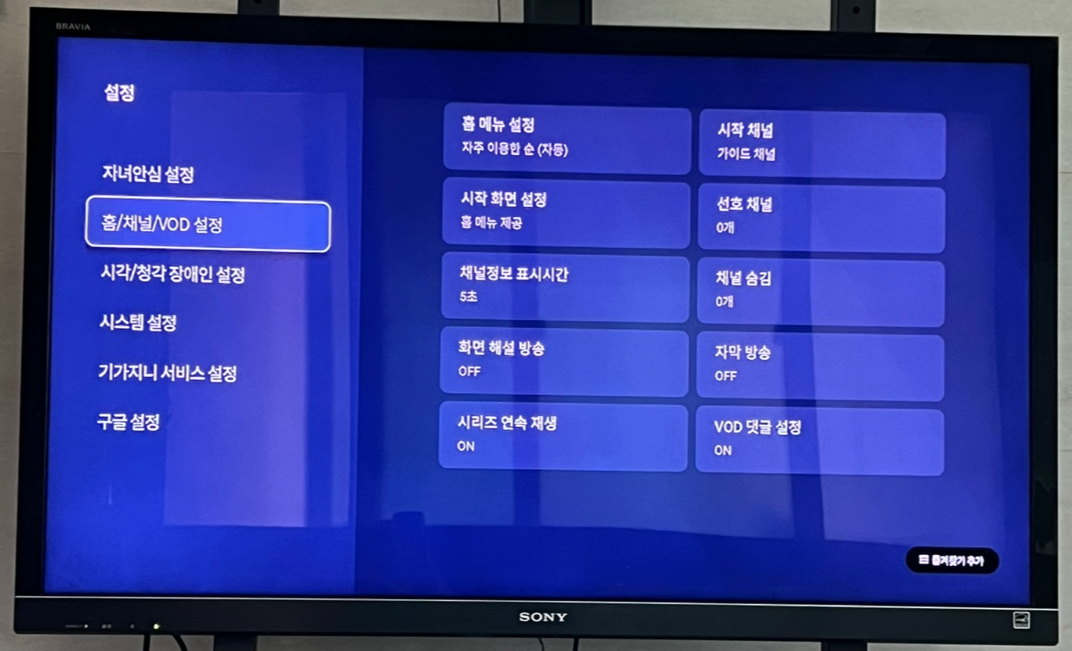 설정 메뉴에서 '홈/채널/VOD 설정'을 선택합니다. 이 항목을 통해 채널 관련 설정을 할 수 있습니다.
