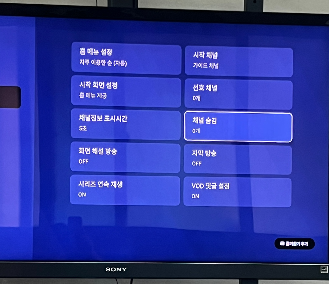 ‘홈/채널/VOD 설정’ 메뉴에서 ‘채널 숨김’ 옵션을 찾습니다. 이 옵션을 선택하여 숨기고 싶은 채널을 지정합니다.