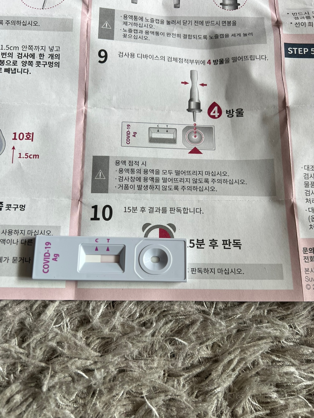 4️⃣ 디바이스 적용: 혼합된 용액을 검사용 디바이스에 4방울 떨어뜨립니다.