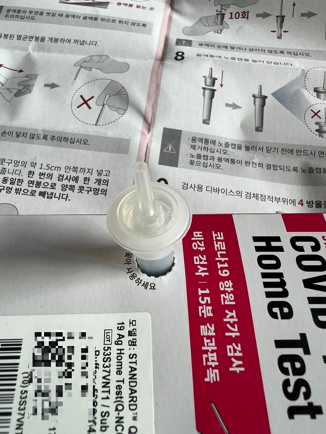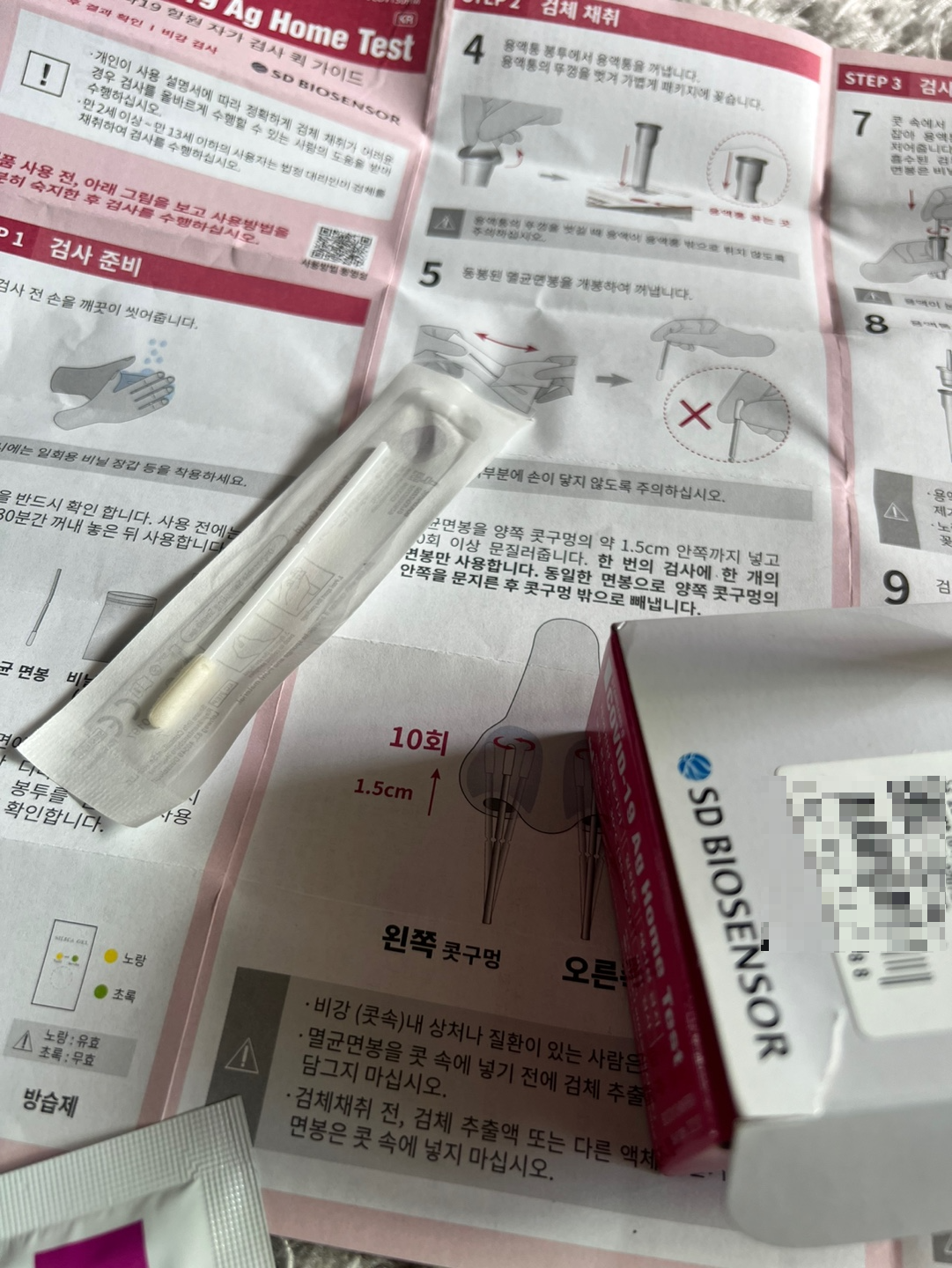 코로나19 자가검사 키트를 열어보면 다음과 같은 구성품이 들어 있습니다: