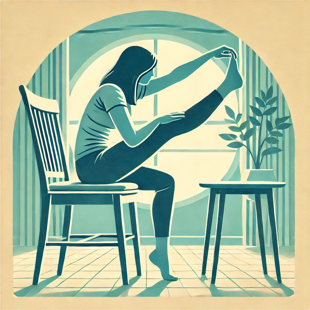 - 의자에 앉은 상태에서 한쪽 다리를 앞으로 뻗고 발끝을 손으로 잡아 천천히 당깁니다.