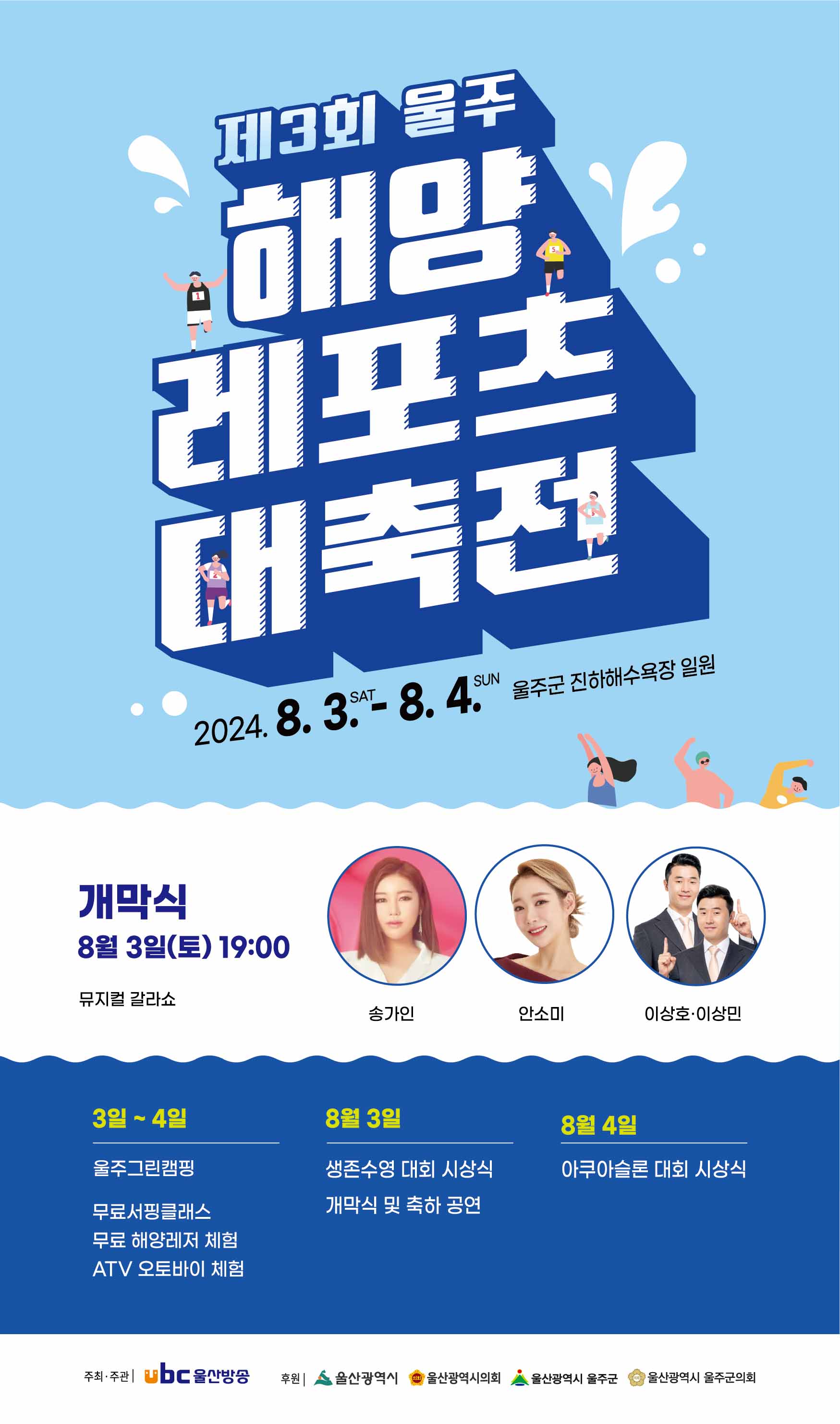 올 여름, 진하해수욕장에서 펼쳐질 '2024 울주 해양레포츠 대축전'에 대해 안내드립니다. 본 축전은 8월 3일(토)부터 4일(일)까지 이틀 동안 개최되며, 다양한 해양레포츠와 축하 공연으로 가득 찬 프로그램을 제공합니다.