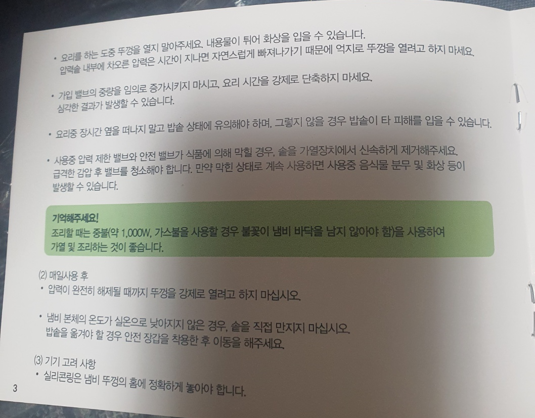 - 안전밸브: 정상 가열 후 솥내 기압이 20KPA 정도 올라가면 안전 밸브가 작동 시작되며, 이때 압력솥은 열리지 않습니다.