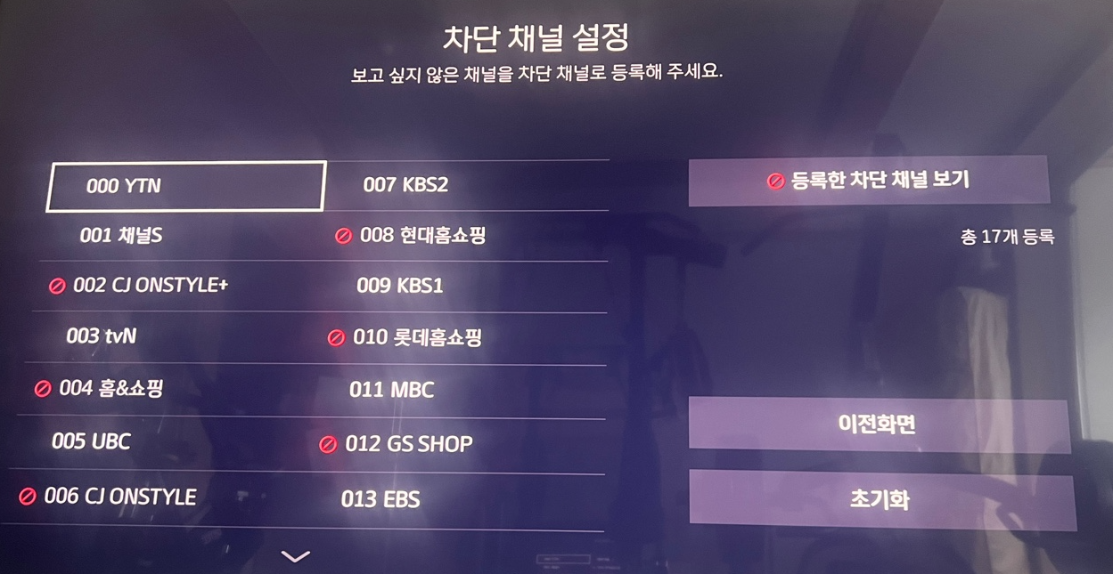 9.차단 설정 완료: 선택한 홈쇼핑 채널을 차단 목록에 추가한 후 ‘확인’ 버튼을 눌러 설정을 완료합니다. 이제 해당 채널은 더 이상 표시되지 않으며, 채널을 돌릴 때 홈쇼핑 채널이 나오지 않습니다.