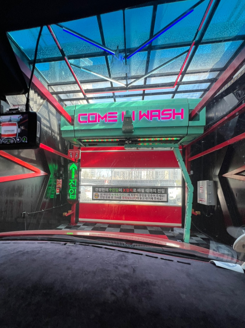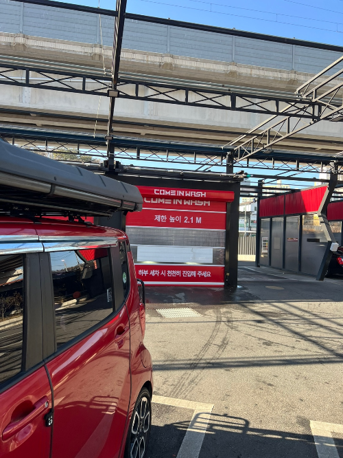 빨간 간판에 큼지막한 'COME IN WASH'가 저를 반겨줬습니다. 입구에서부터 ‘제한 높이 2.1m’라는 경고 문구가 저를 잠시 멈칫하게 했죠.