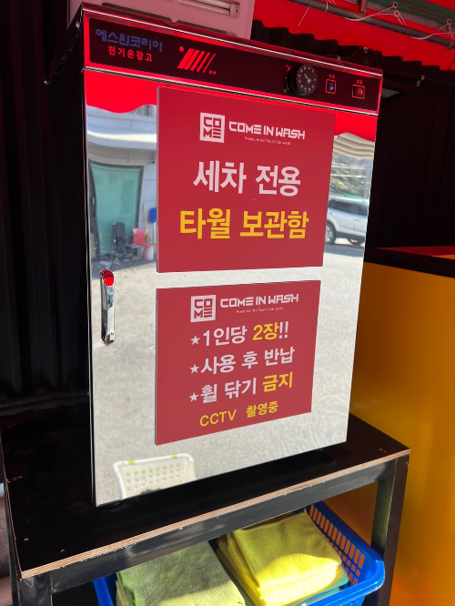 세차가 끝난 후 준비된 타월 보관함에서 타월을 꺼내 열심히 닦아줬습니다. 1인당 2장만 사용할 수 있다는 점, 꼭 기억하세요! (CCTV가 지켜보고 있습니다 👀)